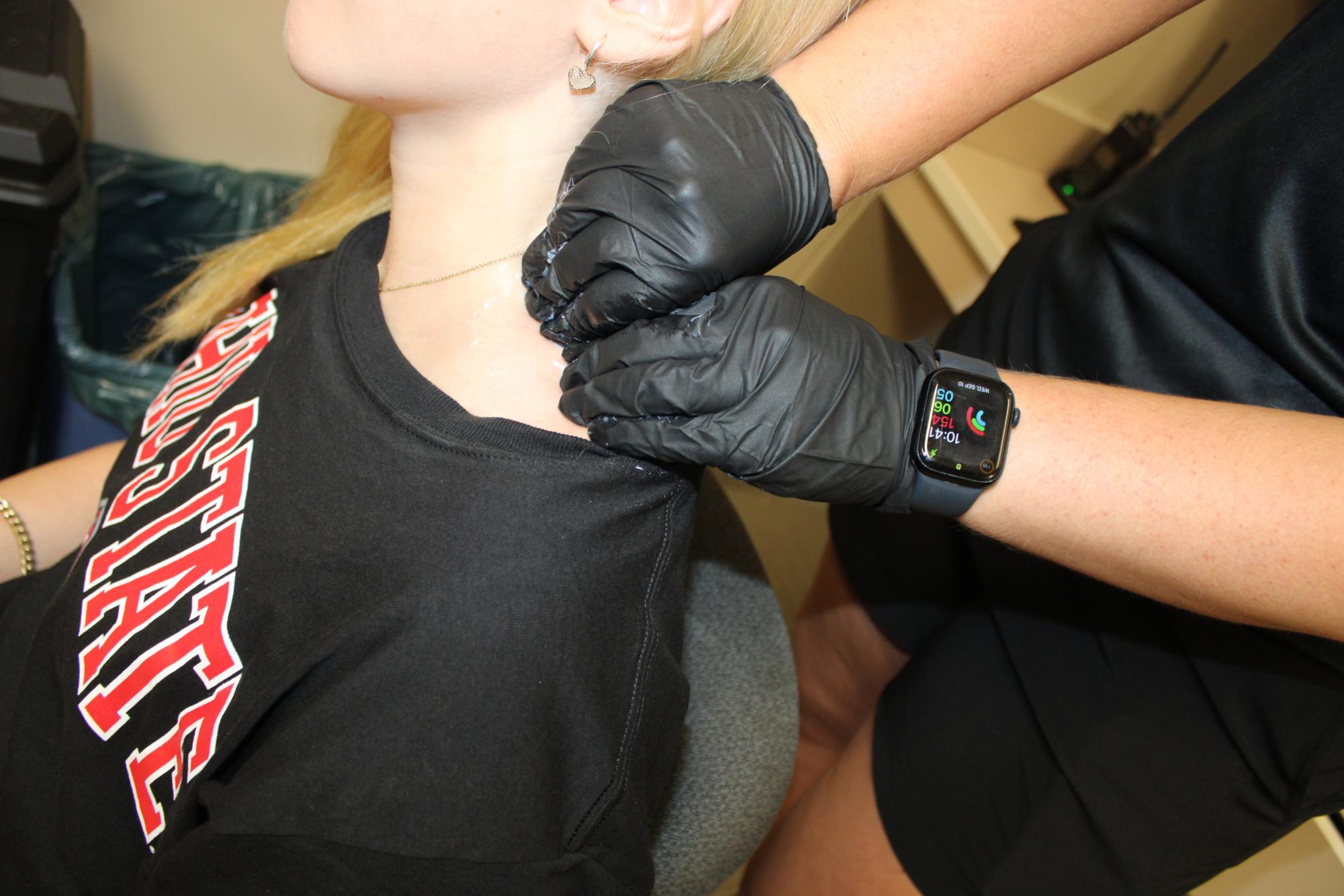 The treatment now begins— many of the athletes will come before or after practice to get deep tissue massages which will help them prevent injury and recover. For Perrotti, treating and preventing injuries isn’t the “be-all and end-all,” when it comes to being an athletic trainer. Everything starts with building a strong athlete relationship that will become the foundation of treatment. In the field of athletic training, it is important that athletes feel safe enough to come to their trainers and share what’s wrong. Failure to build this relationship can lead to athletes withholding information about injuries in turn could lead to lasting detriment on their careers. Fellow athletic trainer, Harrell shares some of this philosophy, but believes in a more hands-on approach.